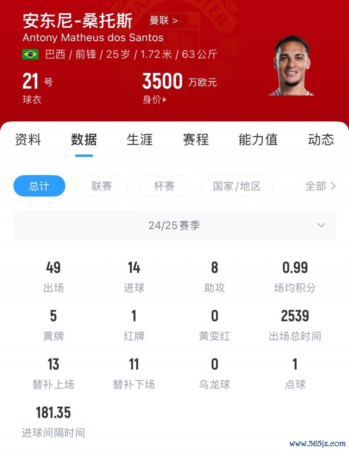 安东尼上赛季各赛事共出战49场,打进14球助攻8次。租赁贝蒂斯时期,安东尼屡次示爱贝蒂斯,抒发留住意愿。