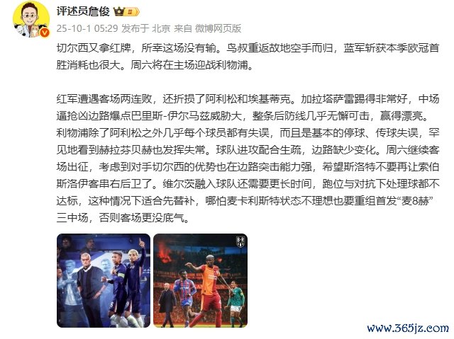 10月01日讯 欧冠联赛阶段第二轮,利物浦爆冷0-1不敌加拉塔萨雷,切尔西1-0降服本菲卡。詹俊发文对当天比赛进行了点评。