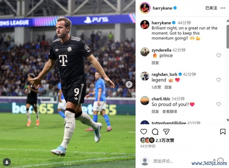 赛后凯恩也在个东说念主社媒晒出庆祝进球像片,配文写说念:“精彩的夜晚,球队势头可以,让咱们不时延续下去!”
