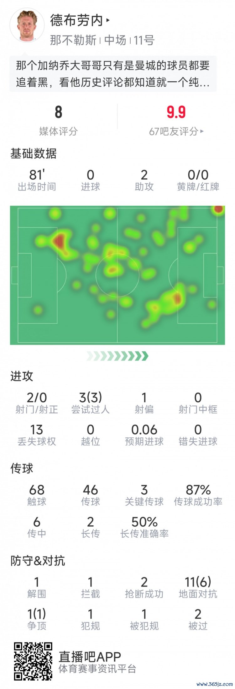 10月2日讯 在本轮欧冠那不勒斯对阵葡萄牙体育的比赛中,德布劳浑家攻双响,以下为他在本场数据: