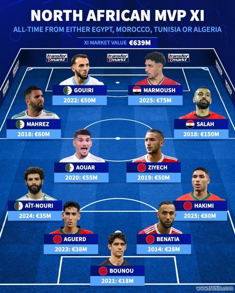 10月15日讯 德国转会商场列出了北非国度(埃及、摩洛哥、突尼斯、阿尔及利亚)球员历史身价最高气势,萨拉赫、马赫雷斯、马尔穆什在列。