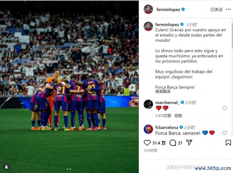 此役费尔明为巴萨破门,赛后他在应付媒体上写谈:“巴萨球迷们!感谢你们在球场和寰宇各地的撑握!”