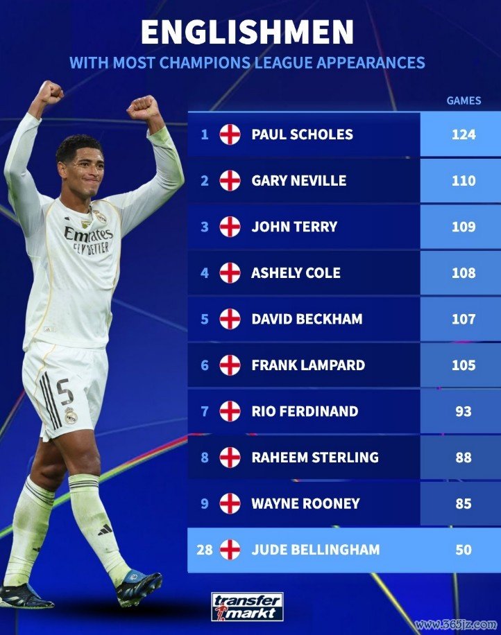11月5日讯 在本轮欧冠,利物浦1-0打败皇马。贝林厄姆完成生计50场欧冠里程碑,德转也清点了英格兰球员欧冠出场次数榜,具体如下: