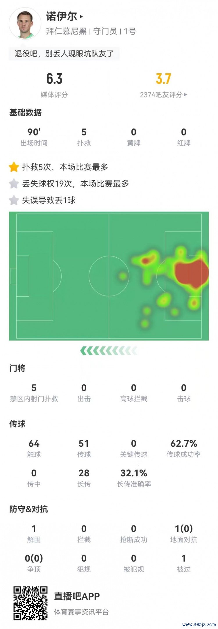 11月27日讯 拜仁在本轮欧冠1-3败走北伦敦,诺伊尔本场数据如下: