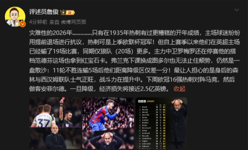 03月06日讯 本轮英超,热刺1-3不敌水晶宫。赛后,评述员詹俊发文点评。