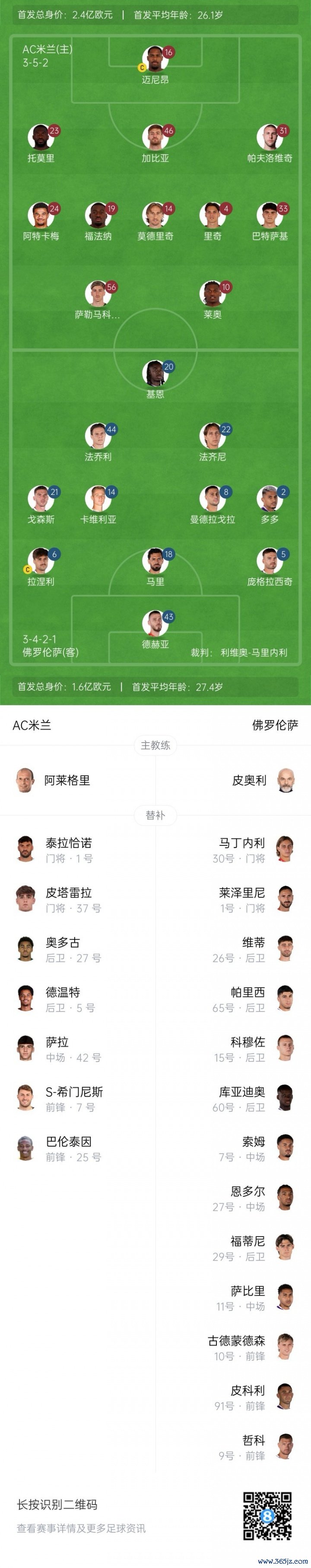 米兰替补:1-泰拉恰诺、37-皮塔雷拉、27-奥多古、5-德温特、42-萨拉、7-S-希门尼斯、25-巴伦泰因