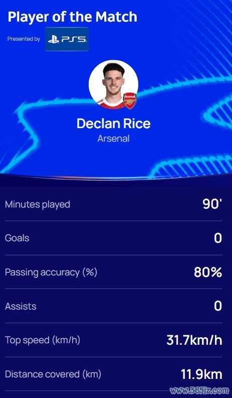 本场比赛赖斯发达出色,传球生服从80%,跑动掩饰11.9km,赛后他当选欧冠官方评比出的本场最好球员。