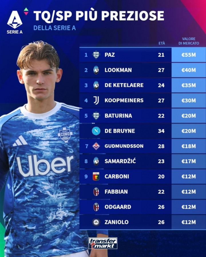 1、尼科-帕斯(科莫):21岁,5500万欧