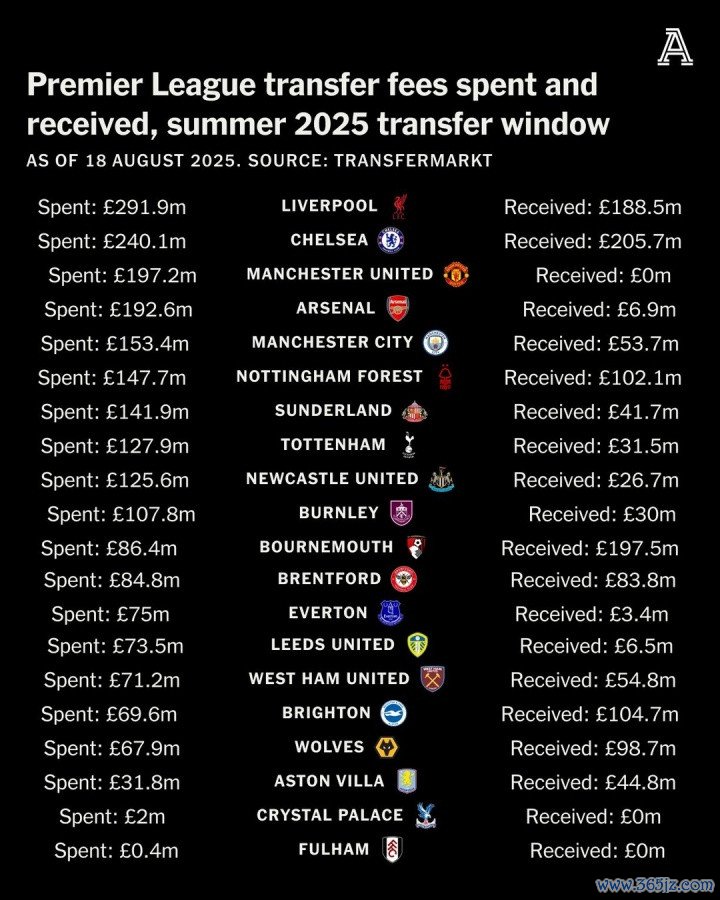直播吧08月19日讯TA统计了放荡至8月18日英超各队的夏窗进出情况,其中利物浦2.9亿镑支拨居首曼联净支拨1.97亿镑最多。