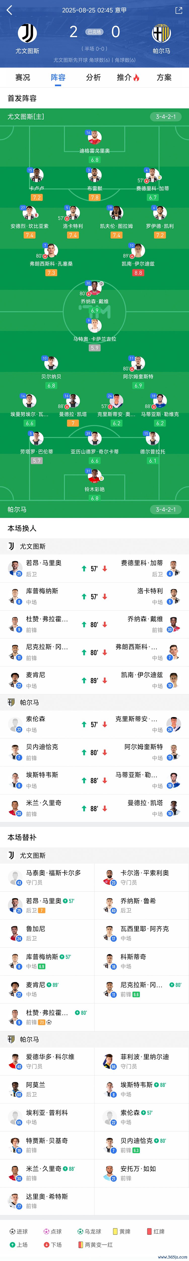 北京时分8月25日凌晨2时45分,2025-26赛季意甲第1轮在安联竞技场伸开角逐,尤文图斯主场迎战帕尔马。上半场孔塞桑造胁迫,下半场戴维获利尤文正赛首球,弗拉霍维奇替补破门,伊尔迪兹两送助攻,坎比亚索膺惩算作染红。最终十东谈主尤文主场2-0驯服帕尔马,尤文赢得新赛季意甲开门红,下轮将客战热那亚。 【比赛关键事件】 尤文跳跃!戴维获利尤文正赛首球,伊尔迪兹助攻!第59分钟,伊尔迪兹左路1V1毁坏下底传中,戴维包抄解脱清静球员抢射到手,尤文1-0帕尔马! 尤文少打1东谈主!坎比亚索膺惩算作染红!第83分钟,坎比亚索膺惩算作肘击洛维克,裁判成功出示红牌罚下坎比亚索! 尤文2球跳跃!弗拉霍维奇替补破门,伊尔迪兹两送助攻!第84分钟,弗拉霍维奇作念球发动反击,伊尔迪兹高速鼓吹后横传,弗拉霍维奇跟进推射破门,尤文2-0帕尔马! 【比赛焦点眨眼间】 赛前,两边球员抓手问候。 第4分钟,帕尔马纵滥觞抛球掷出,洛维克后点射门被挡出底线。 第13分钟,小图拉姆45度角传中到禁区,孔塞桑头球冲顶被铃木彩艳扑出。 第30分钟,孔塞桑禁区前沿低射被铃木彩艳充公。 第43分钟,图多尔向裁判衔恨吃到黄牌。 第50分钟,伊尔迪兹左路内切潜力射略微打偏。 中柱!第54分钟,孔塞桑外围远射折线后击中立柱弹出。 第56分钟,铃木彩艳发球速率太慢染黄。 第70分钟,索伦森飞铲马里奥吃到黄牌。 第79分钟,戴维作念球,伊尔迪兹禁区弧顶突施暗箭被铃木彩艳化解。 第80分钟,戴维和孔塞桑被替换下场,弗拉霍维奇和冈萨雷斯登场。 全场比赛范围,十东谈主尤文图斯主场2-0驯服帕尔马。