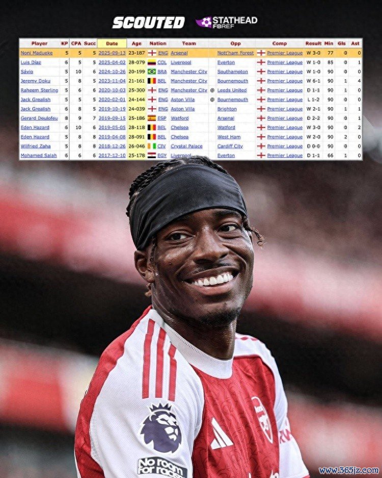 直播吧9月16日讯 FBRef统计标明,马杜埃凯是阿森纳首位单场英超5次见效过东说念主、5次带球投入禁区和5次关节传球的球员。