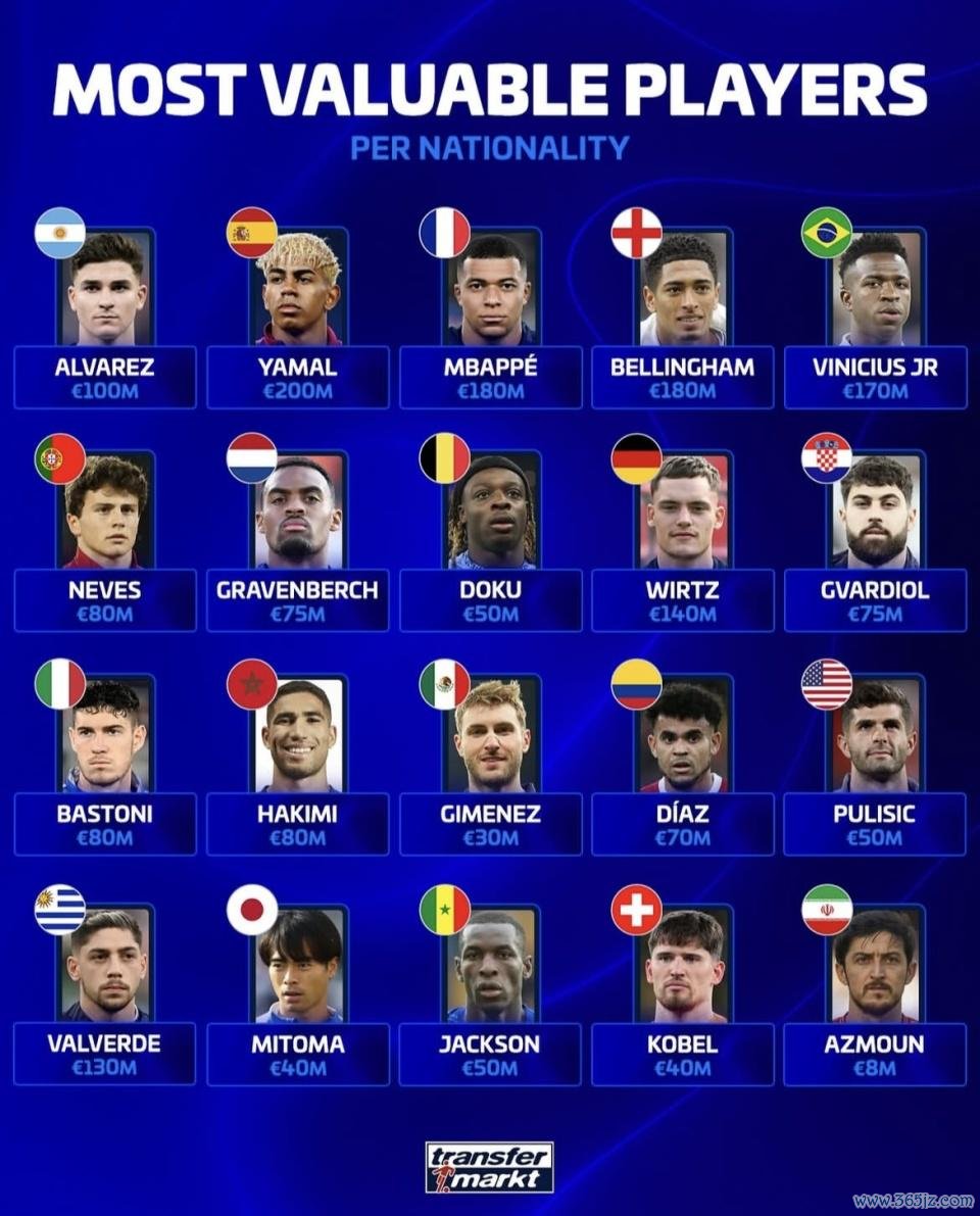 近日,有名足球数据网站德国转会市集发布了最新一期“列国身价最高球员”榜单,数据舍弃北京技能2025年9月6日。本次榜单涵盖五大洲二十位球员,全面展现了现在足坛不同国籍的顶尖代表。