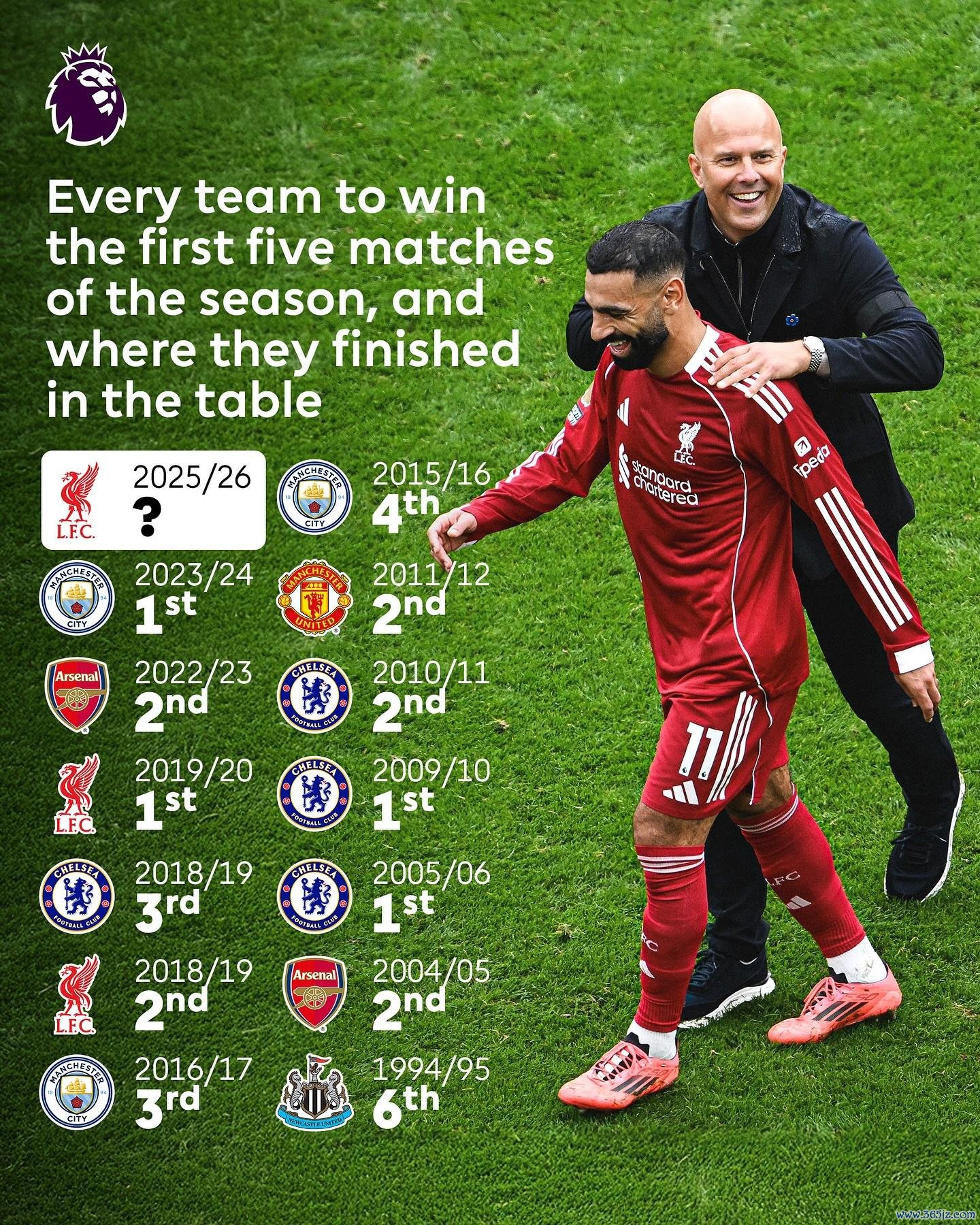 在2-1打败埃弗顿后,利物浦获取英超开局五连胜,据统计,这是英超历史上第14次有球队获取开局5连胜,此前获取开局5连胜的球队有4次最终夺冠。