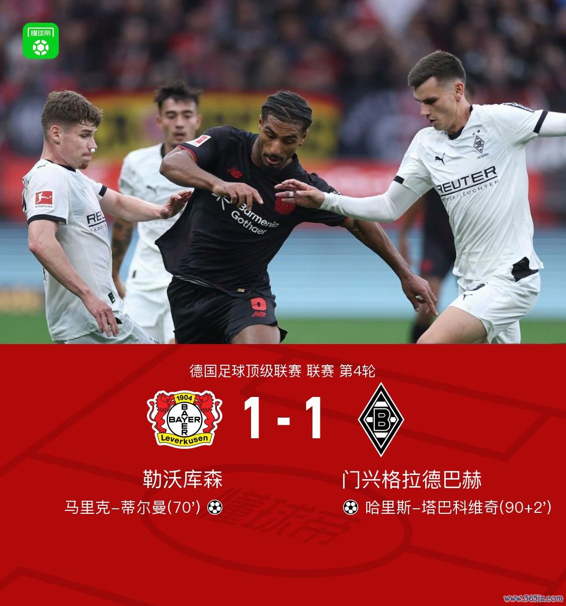 第90+3分钟,哈里斯-塔巴科维奇抢点头球破门绝平比分,门兴1-1