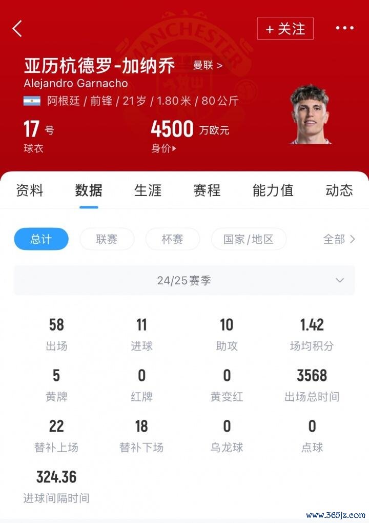 加纳乔现年21岁,上赛季各赛事出场58次,孝顺11球10助。当今球员德回身价为4500万欧元。