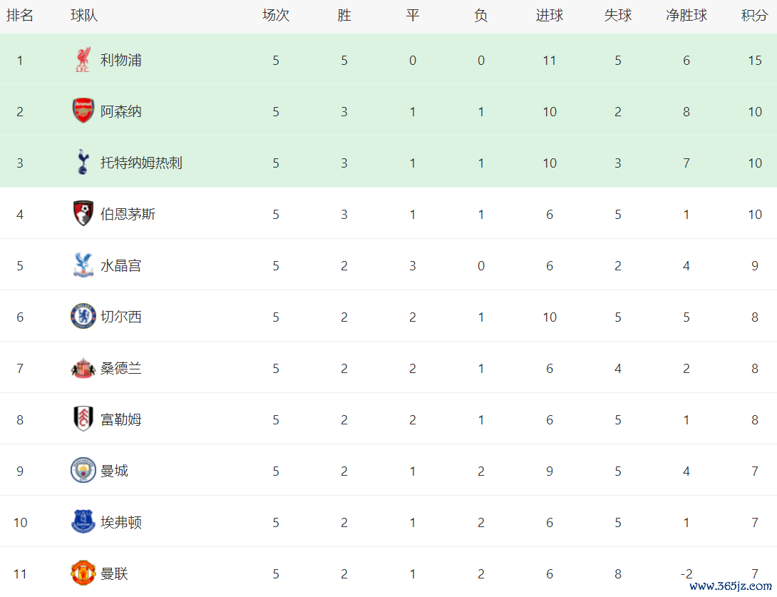 这一轮繁多强队纷繁丢分,只须利物浦最稳。在积分榜上,5战全胜的利物浦以15分排行榜首。竞争敌手齐丢分,利物浦扩大了跨越上风。排行第2的是阿森纳,拿到10分。热刺和伯恩茅斯也齐是10个积分。水晶宫9分排行第5。第6的是切尔西,只拿到8分。曼城2胜1平1负,只拿到7分,排行第9。曼联亦然7分,排行第11。