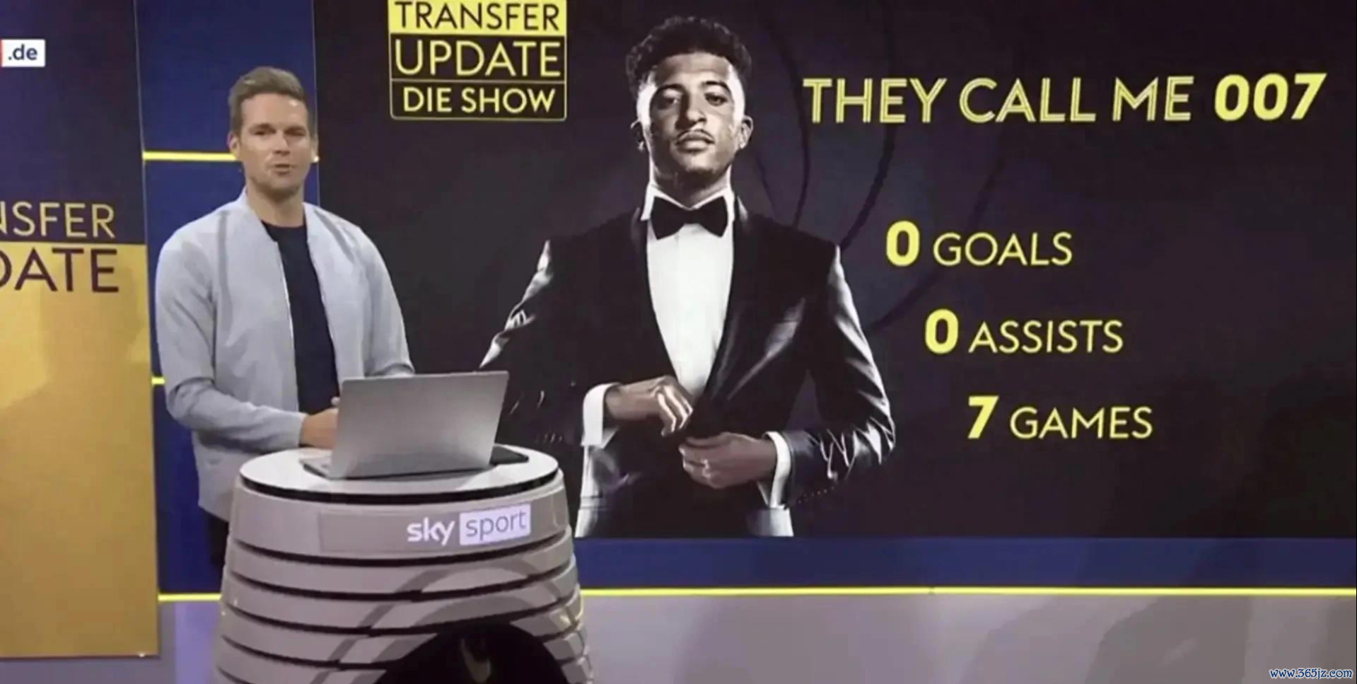 这是德国天外体育节目《转会更新》(Transfer Update. Die Show)的截图。真谛真谛的是,这并非主抓东谈主的原创——他们仅仅将外交媒体上对于桑乔在曼联起步回击的梗推向了新高度。
