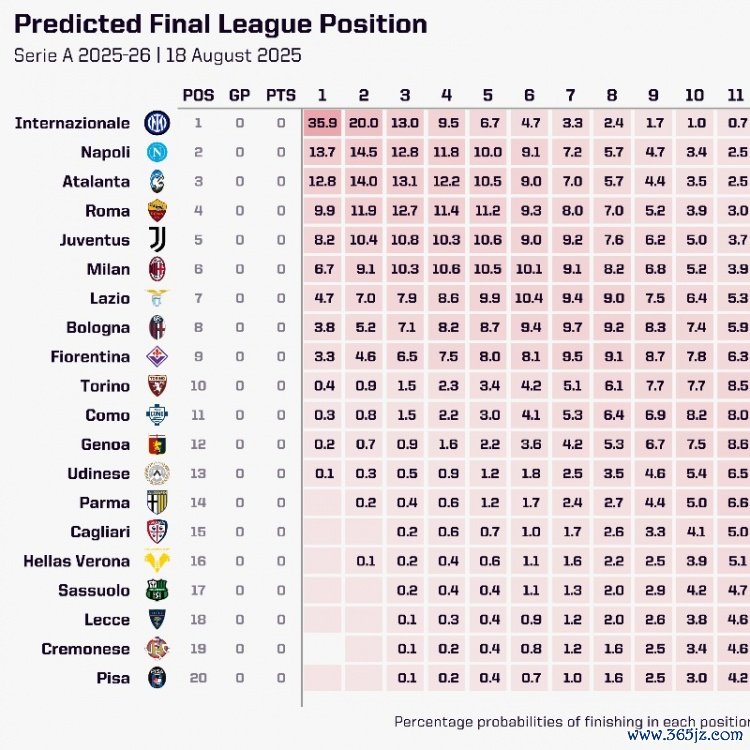 8月21日讯 opta通过超等绸缪机权衡本赛季意甲名次,国米有35.9%的概率夺冠,在夺冠概率上那不勒斯、亚特兰大分列二三位。