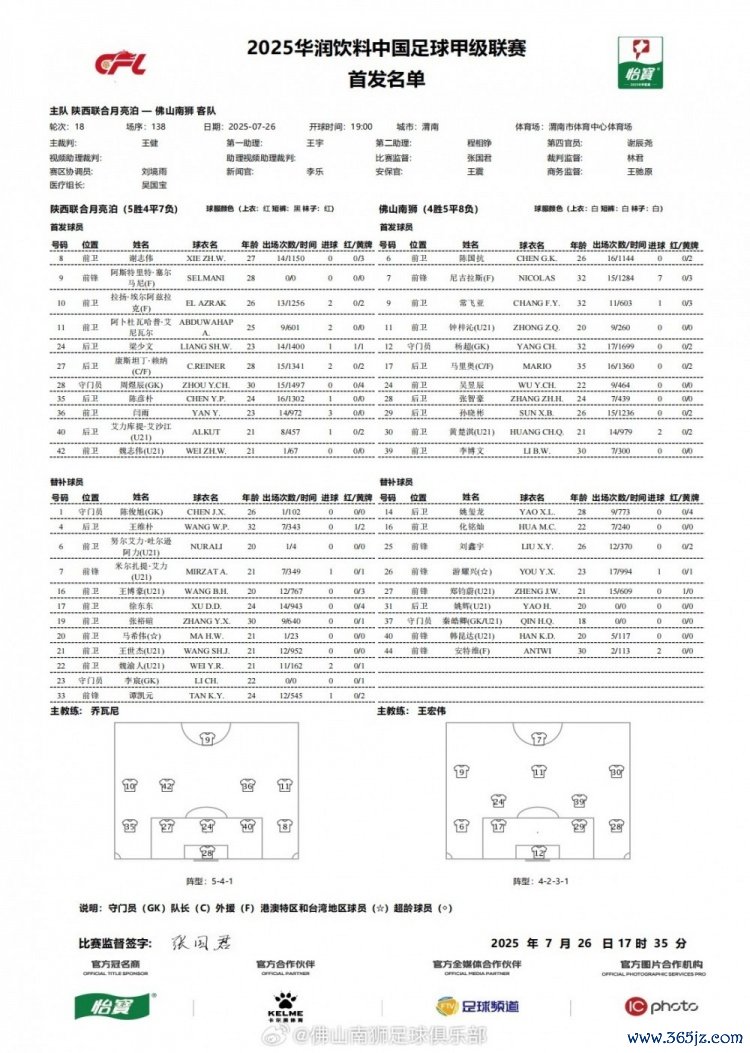 首发名单|2025华润饮料中甲联赛第18轮 陕西贯串vs佛山南狮