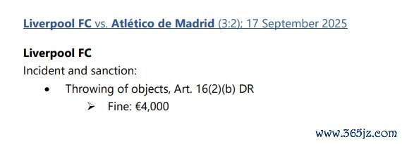 10月01日讯 欧冠首轮比赛,利物浦3-2驯服马竞。本场比赛中,利物浦因为球迷投掷物品,违抗《欧足联标准准则》第16(2)(b)条,俱乐部被罚金4000欧元。