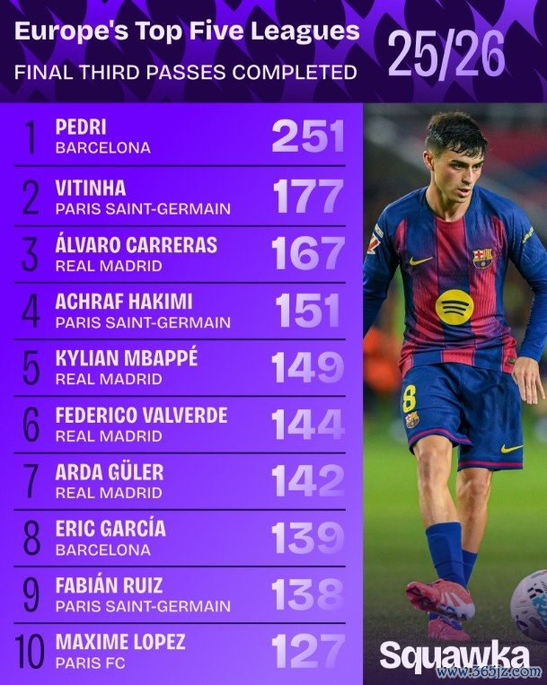 10月1日讯 数据网站Squawka统计本赛季五大联赛垂危三区完成传球数,巴萨中场佩德里断档逾越,皇马4东谈主参加前十。