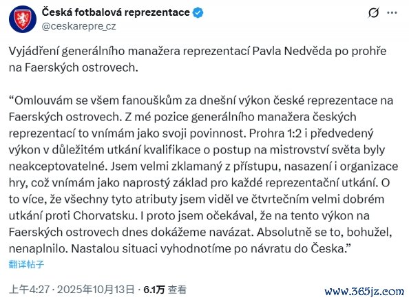 此役失利后,捷克国度队官推发布了捷克国度队总司理内德维德的致歉声明。