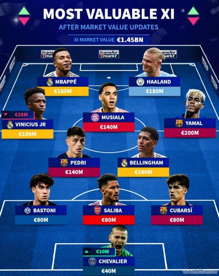 10月19日讯 德转此前更新了足坛球员身价,并盘货了当今身价最高的11东说念主声势,总身价14.5亿欧,其中亚马尔2亿欧最高,具体声势如下: