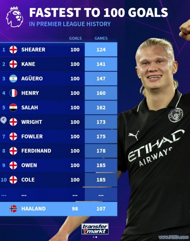11月3日讯 德转清点了英超历史实现百球最快用时榜,而哈兰德107场98球至极有望创造新的记载,以下为具体榜单: