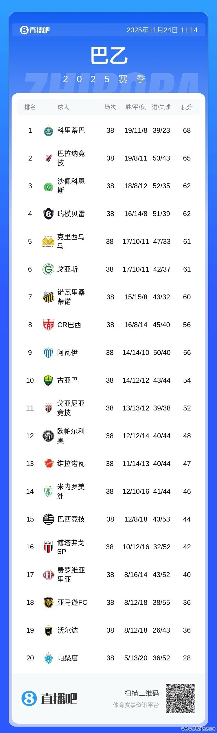 11月24日讯 2025赛季巴乙联赛扫尾一齐争夺,科里蒂巴等4队升入巴甲。